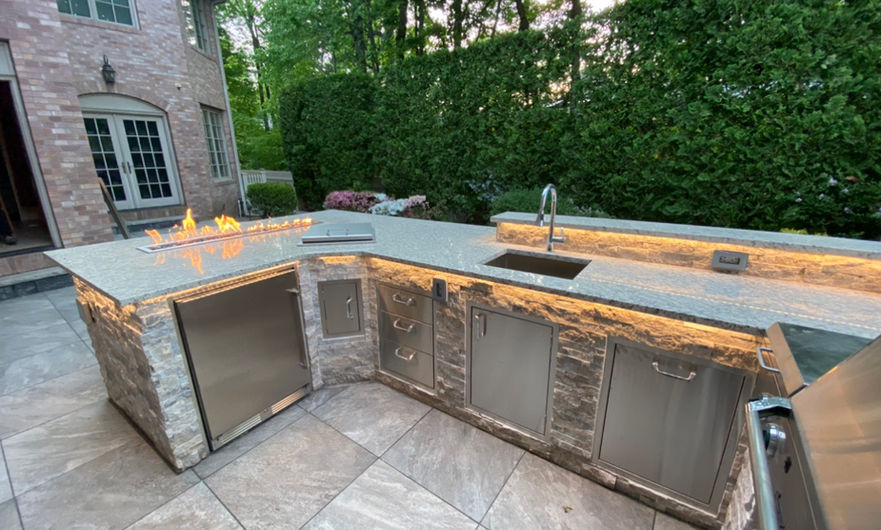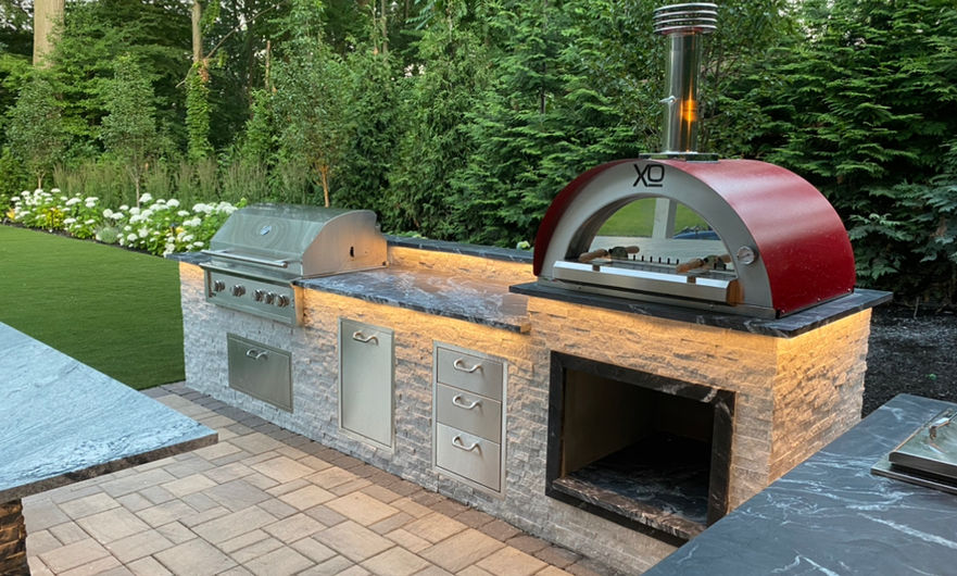 We can finish the countertops in Granite, our most popular material, because of its outdoor durability. You can also choose a Quartzite, Bluestone, Soapstone, and Porcelain Slab, such as Dekton, available in different finishes and edges to complete your outdoor kitchen.