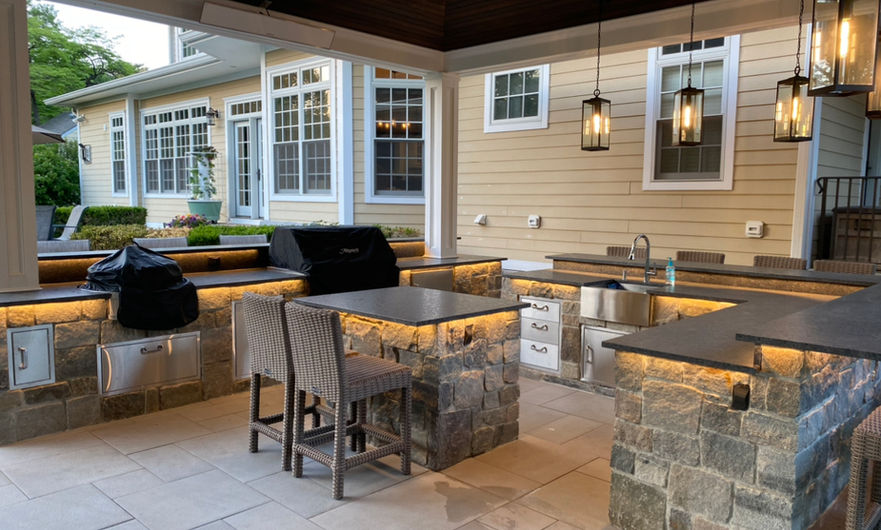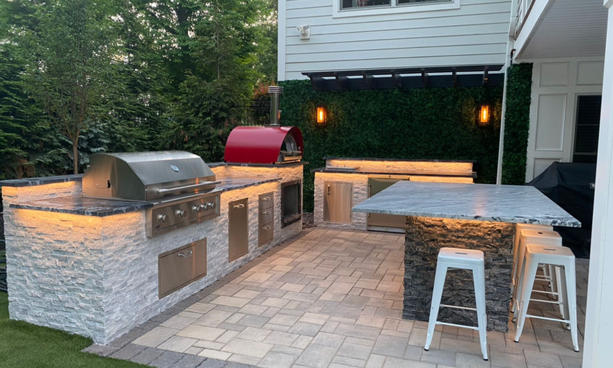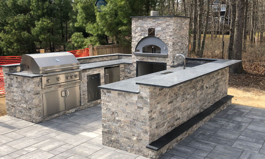 Our Classic Outdoor Kitchens are completed with a natural stone veneer and countertop. We construct the designs with our custom-built modular cabinets, allowing unlimited configurations, from a simple outdoor grilling area to a complete gourmet outdoor kitchen. Counter and bar height seating can be added to any layout. You can bring your design, an architect rendering, or work with one of our designers to create your dream Outdoor Kitchen.